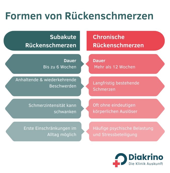 - Subakute Rückenschmerzen: Sie bestehen über mehrere Wochen hinweg, ohne dass eine eindeutige Ursache zu erkennen ist. Diese Form gilt als Übergangsphase.